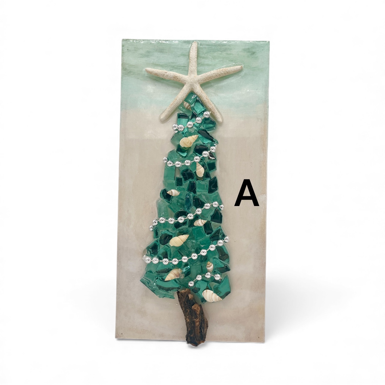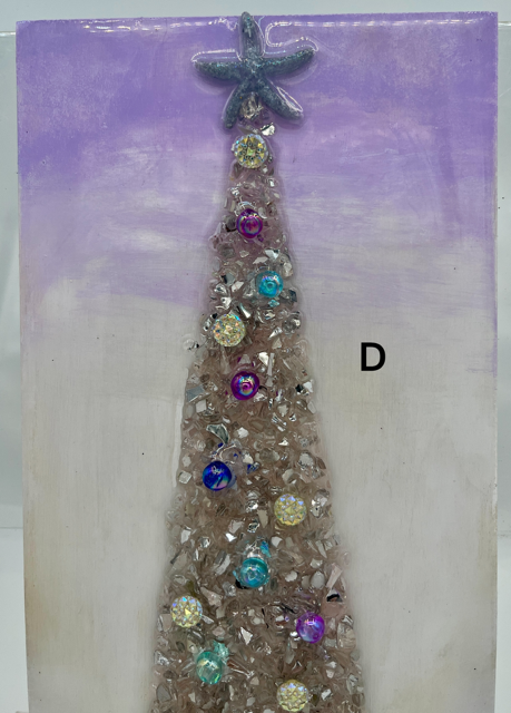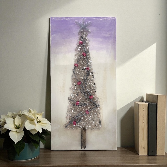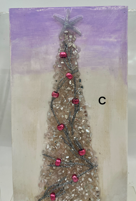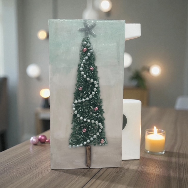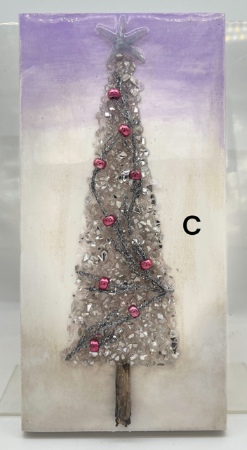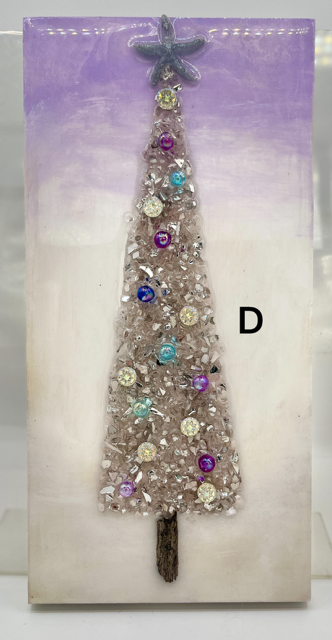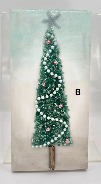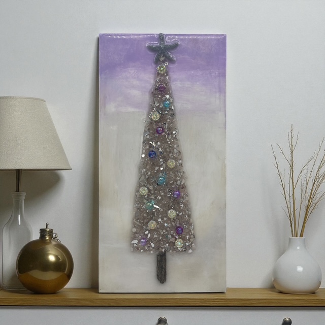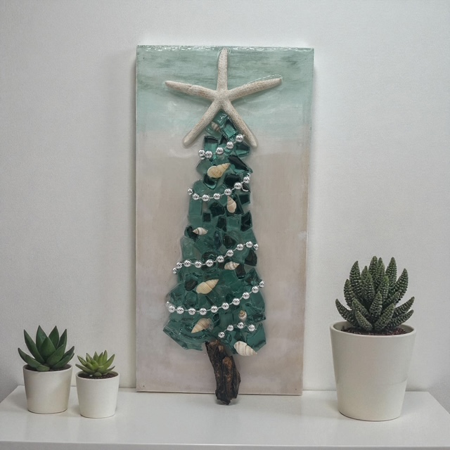These unique Christmas decorations feature shimmering crushed glass trees, natural driftwood trunks, hand-placed beads, shells, and sparkles that catch the light beautifully. Each piece is carefully crafted to bring texture, shine, and add an tasteful winter glow to any space.
